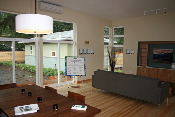 The photo gallery above showcases various aspects of the media tour given to us by Dan Saddler, formerly from the Earth Advantage Institute, a local organization that works with builders and developers to bring the most energy efficient and sustainable green construction to the market. Saddler, in addition to pointing out the energy and water conservation features of the Water House, also detailed healthy indoor air items, such as a HRV/ERV ventilation system and hard surface flooring, which make this house a cleaner environment to live in.
