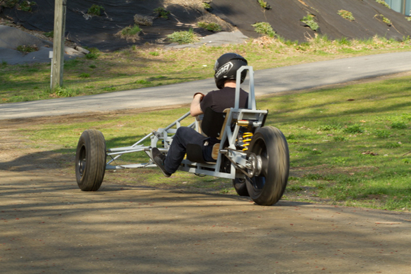 Sporting a frame of 4140 high carbon steel and a drive train that is a belt drive to jackshaft with QD pulleys, to a chain final drive, the open three wheel, one seater has a very light weight of just 380 pounds with the batteries.